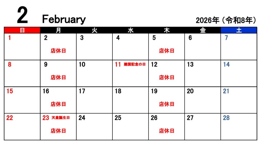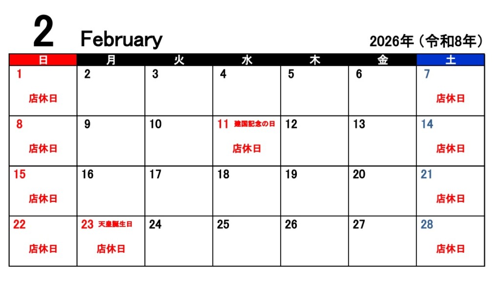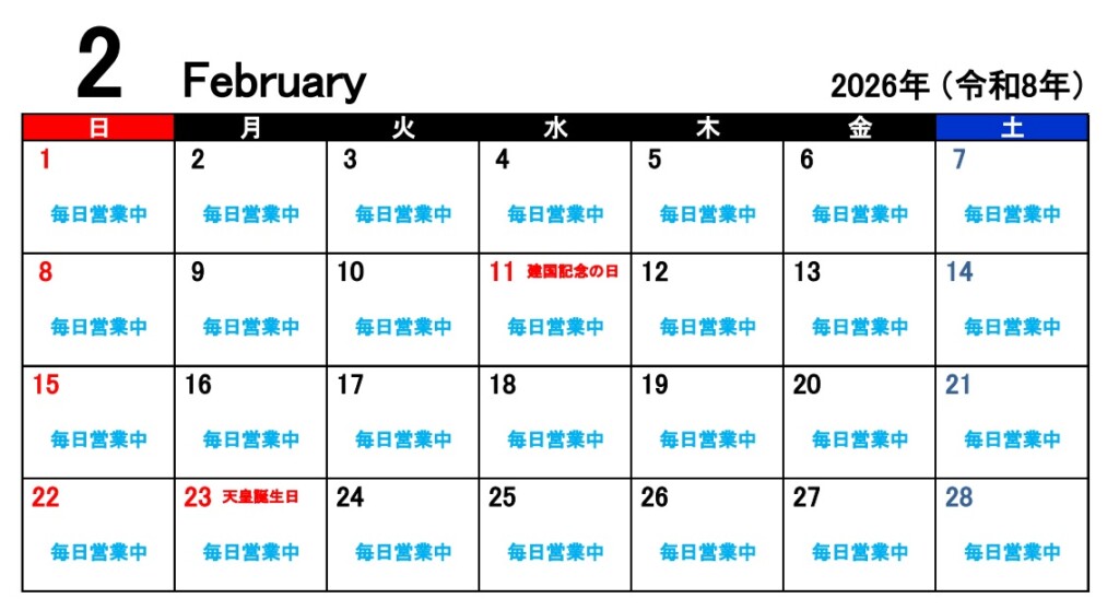 2026年2月営業日カレンダー [各店舗別] 2026.01.31 カテゴリー: お知らせ 目次1 ▼本 店 カ レ ン ダ ー▼2 ▼博多駅前店 カレンダー▼3 ▼ 新宿御苑駅前店 カレンダー ▼ ▼本 店 カ レ ン ダ ー▼ ▼博多駅前店 カレンダー▼ ▼ 新宿御苑駅前店 カレンダー ▼ Share ツイート LINE